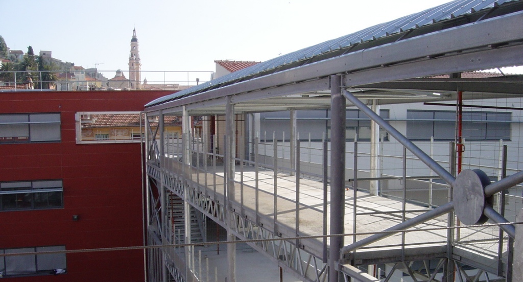 Les qualités intrinsèques de l’acier concilient la légèreté visuelle et la résistance mécanique nécessaire au transit de centaines de collégiens. Cette passerelle métallique permettant de relier les deux extensions de ce collège à Menton à l’ancien bâtiment réhabilité.