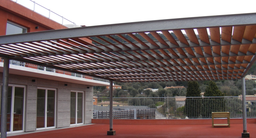 L’alliance du bois et de l’acier sont dans l’air du temps. Elle permet la création d’ouvrages esthétiques combinant les avantages des deux matériaux comme ici dans cet Ehpad où une zone de repos ombragée a été réalisée pour les résidents sur les terrasses panoramiques à Tourettes Levens.